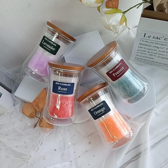 【かすかに輝くクリスタルと氷のテクスチャー】私たちのキャンドルには美しいクリスタルの少量が含まれています。香り付きキャンドルごとに美しい微細なグリッターが付属しており、キャンドルは輝き、とてもロマンチックに見えます。これらの魂を癒すクリスタルはネガティブなエネルギーを取り除きます。燃えると、キャンドルは溶けた氷のように見えます。丸いガラス瓶は可愛らしく、太陽光の中でカラフルな光を反射します。キャンドルが使い終わった後は、このボトルを容器として使用することができます。