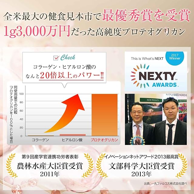 ✅全米最大の食品・サプリメントの見本市で新成分最優秀賞を受賞した高純度プロテオグリカンのみを使用しており、青森県庁や弘前大学を始めとする産学官連携団体「あおもりPG推進協議会認証商品」です。
