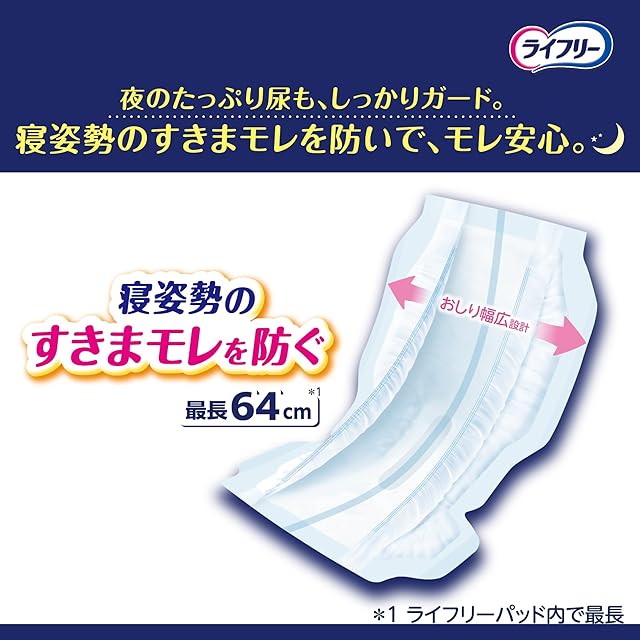 おしりをすっぽり包み込んでスキマをつくらない、幅広形状がしっかりガードし寝返りモレと後ろモレを防ぎます。
