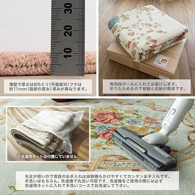 【組成】[表面]ポリエステル95 % / 綿5% /[裏面] 不織布・滑り止めドット付き(ポリエステル100%) 【厚み】[平織り平面の厚み]約5mm [端部の厚み]約11mm 薄型タイプ