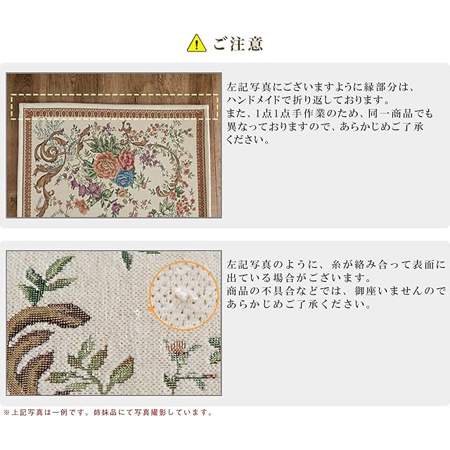 【輸入カーペットを安心してご利用いただくためのお願い】 ●輸入ラグに関して ※同じ商品でも製造ロットの違いによって、サイズや、色味、柄模様の左右が反転していたり、位置がズレている場合がございます。ただし、現地の工場や倉庫での検品をクリアした商品を輸入しています。あらかじめご了承くださいませ。/ ●においに関して ※ご使用当初、裏面に塗られる仕上げの接着塗料(ラテックス剤)のにおいがする場合がございます。人体への影響はありませんが、においに敏感の方や、ご心配の方はご理解の上ご購入お願いいたします。開封後常温のもとで気化(蒸発)するため、においはご使用につれてなくなります。気になる場合は風通しの良いところで陰干ししていただきますと、より早く解消されます。/ ●サイズに関して ※カーペットの製法上、表示サイズより0~3%の誤差がございます。/ ※いずれも商品の初期不良ではございませんので返品・交換は行なっておりません。(※お客様で返品の送料ご負担によるキャンセルは、返品規定に基づきお受けさせていただきます。)