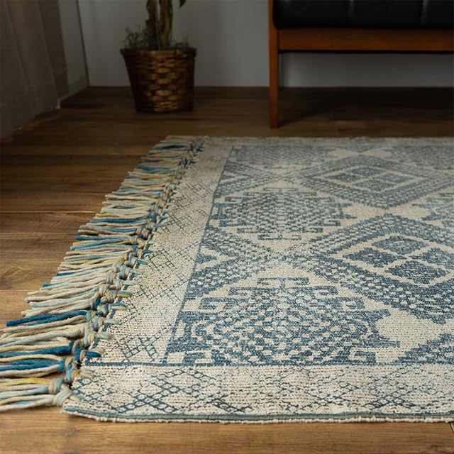【備考】洗濯可(洗濯ネットをご使用ください、乾燥機は不可) / 折りたたみ可 / 床暖房の上敷き、ホットカーペットカバー対応 (※商品写真は100x150cmを使用しております。)/風合いにこだわる為、糸をミックスしてヴィンテージ感が出るよう作られております。一点一点手作業で作る為に織りムラや歪みなどがございますが、ハンドメイドの味わいをご理解の上ご購入お願いいたします。/フリンジはウール素材となり遊び毛が出ます。/洗濯時に色落ちする場合がございますので、漂白剤及び漂白剤入りの洗剤のご使用は避け、他の物と分けて単独でお洗いください。洗濯で縮みますのでご注意ください。/完全に乾いた状態でご使用ください。/インド綿製品は色落ちしやすい特性があります。摩擦や水濡れ、汗によって色が移る可能性がございます。/インド綿の特性上、織りムラ、節、ネップ等ございますのでご了承の上、ご購入ください。/ 商品は[丸巻き]または[折りたたみ]の状態でお届けいたします。