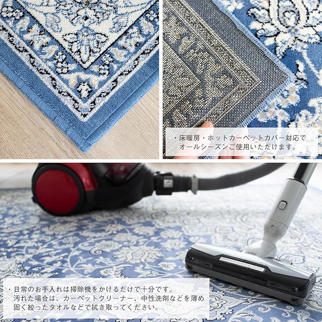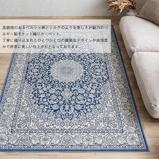 【輸入カーペットを安心してご利用いただくためのお願い】 ●輸入ラグに関して ※同じ商品でも製造ロットの違いによって、サイズや、色味、柄模様の左右が反転していたり、位置がズレている場合がございます。ただし、現地の工場や倉庫での検品をクリアした商品を輸入しています。あらかじめご了承くださいませ。/ ●においに関して ※ご使用当初、裏面に塗られる仕上げの接着塗料(ラテックス剤)のにおいがする場合がございます。人体への影響はありませんが、においに敏感の方や、ご心配の方はご理解の上ご購入お願いいたします。開封後常温のもとで気化(蒸発)するため、においはご使用につれてなくなります。気になる場合は風通しの良いところで陰干ししていただきますと、より早く解消されます。/ ●サイズに関して ※カーペットの製法上、表示サイズより0~3%の誤差がございます。/ ※いずれも商品の初期不良ではございませんので返品・交換は行なっておりません。(※お客様で返品の送料ご負担によるキャンセルは、返品規定に基づきお受けさせていただきます。)/ ※裏面の製品シールは剥がさないでご使用ください。