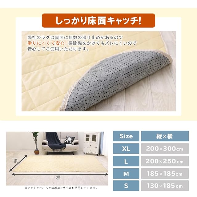 【抗菌・防ダニラグ】サイズ:200×300cm 表地:ポリエステル100% パイル長さ:約5mm 中材:抗菌・防ダニ中綿とウレタンフォーム約8mm 裏面:不織布(滑り止め加工) ずれにくいキルティング加工