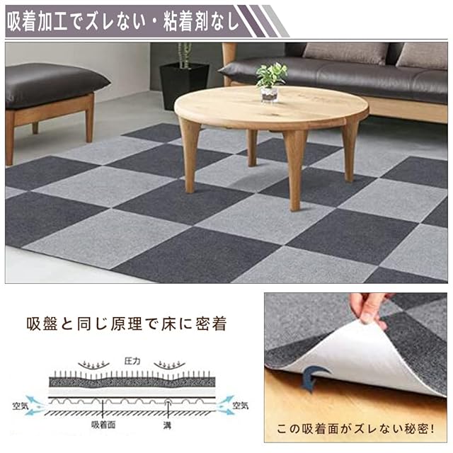 【ジョイントマット 超強な吸着力】タイルカーペットは特殊な裏側の構造で吸盤のようにピタッと張り付くで、おくだけでもズレにくいです。上で走り回っても、掃除機をかけても、ずれにくくストレスがありません。しかも、ピタッと張り付くでも、テープのようにべたべたせず、跡が残りにくいです。ペット連れのご家族、お子様、お年寄りに最適です。