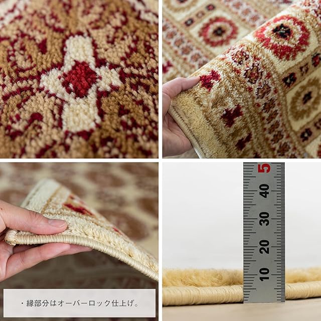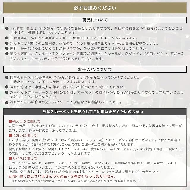 【輸入カーペットを安心してご利用いただくためのお願い】 ●輸入ラグに関して ※同じ商品でも製造ロットの違いによって、サイズや、色味、柄模様の左右が反転していたり、位置がズレている場合がございます。ただし、現地の工場や倉庫での検品をクリアした商品を輸入しています。あらかじめご了承くださいませ。/ ●においに関して ※ご使用当初、裏面に塗られる仕上げの接着塗料(ラテックス剤)のにおいがする場合がございます。人体への影響はありませんが、においに敏感の方や、ご心配の方はご理解の上ご購入お願いいたします。開封後常温のもとで気化(蒸発)するため、においはご使用につれてなくなります。気になる場合は風通しの良いところで陰干ししていただきますと、より早く解消されます。/ ●サイズに関して ※カーペットの製法上、表示サイズより0~3%の誤差がございます。/ ※いずれも商品の初期不良ではございませんので返品・交換は行なっておりません。(※お客様で返品の送料ご負担によるキャンセルは、返品規定に基づきお受けさせていただきます。)/ ※裏面の製品シールは剥がさないでご使用ください。