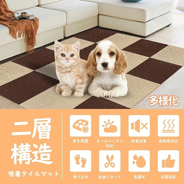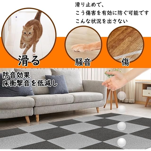 【防音保温】4mmの丁度いい厚さ、表面材のポリエステルは強く保温性をもたらして、熱伝導性に優れ、夏場はしっかり通気、冬場は床暖房の熱がしっかり部屋内の温度をロックする、オールシーズン対応。素足でも快適に歩き回れます、タイルカーペットの密度が細かいので、真空状態を醸し出すものだから、よく防音効果をもたして、ペットやお子様が走り回る足音及び掃除機をかける音などの騒音が減っていました。