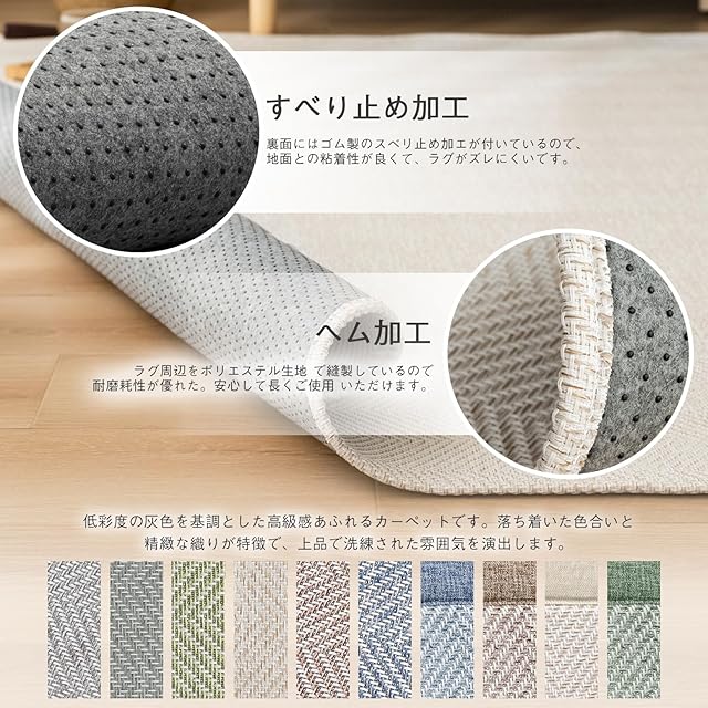 【お手入れ簡単】部分的に汚れた時は、中性洗剤を薄く溶かした水をタオルなどに含ませ、固く絞って拭き取ってもいいです。厚さはロボット掃除機が乗り越えられる厚みです。カーペットは折りたたんだ状態で包装されており、輸送中にしわが発生するのは通常の現象です。梱包を開封してカーペットを平らに広げ、自然に置いておけば、3~10日以内に元の状態に戻ります。【機能/素材】滑り止め、防音、耐磨耗性、色褪せなし、遊び毛が出にくい、安定感あり、軽量タイプ。お部屋に一枚敷くだけで、優しく、やわらかな空間になるようなナチュラルテイストにこだわったアイテムをラインナップしています。 組成:表生地:ポリエステル100%、充填物:ウレタンフォーム、裏生地:不織布 ポリエステル100% 。
