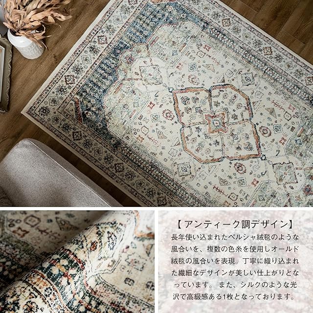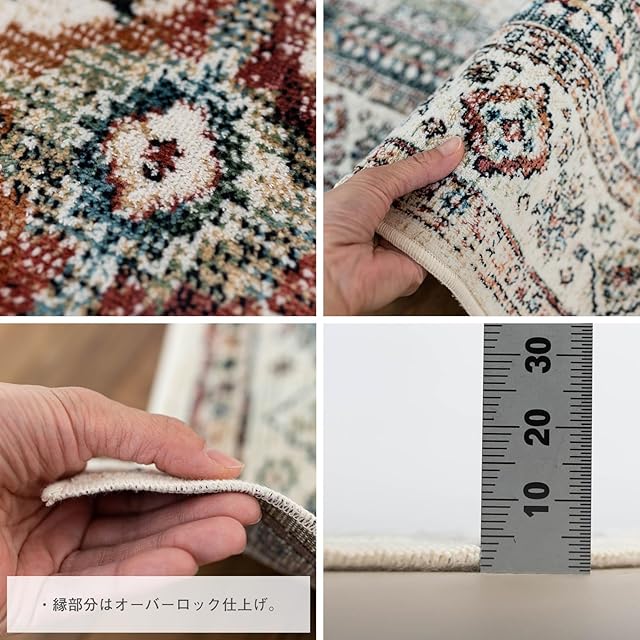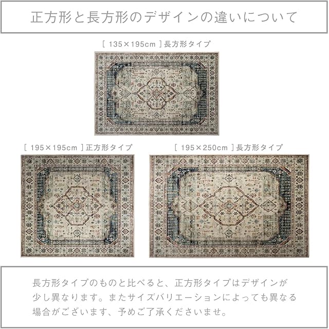 【輸入カーペットを安心してご利用いただくためのお願い】 ●輸入ラグに関して ※同じ商品でも製造ロットの違いによって、サイズや、色味、柄模様の左右が反転していたり、位置がズレている場合がございます。ただし、現地の工場や倉庫での検品をクリアした商品を輸入しています。あらかじめご了承くださいませ。/ ●においに関して ※ご使用当初、裏面に塗られる仕上げの接着塗料(ラテックス剤)のにおいがする場合がございます。人体への影響はありませんが、においに敏感の方や、ご心配の方はご理解の上ご購入お願いいたします。開封後常温のもとで気化(蒸発)するため、においはご使用につれてなくなります。気になる場合は風通しの良いところで陰干ししていただきますと、より早く解消されます。/ ●サイズに関して ※カーペットの製法上、表示サイズより0~3%の誤差がございます。/ ※いずれも商品の初期不良ではございませんので返品・交換は行なっておりません。(※お客様で返品の送料ご負担によるキャンセルは、返品規定に基づきお受けさせていただきます。)/ ※裏面の製品シールは剥がさないでご使用ください。