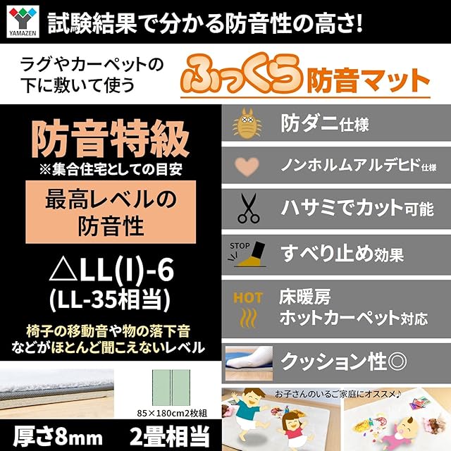 山善(YAMAZEN) 防音マット 防音特級 △LL(I)-6 LL-35相当 厚さ8mm 2畳相当 (85×180cm2枚組) 防ダニ ハサミで切れる すべり止め 床暖房・ホットカーペット対応 折りたたみ 足音 騒音 アイボリー FBM8-2