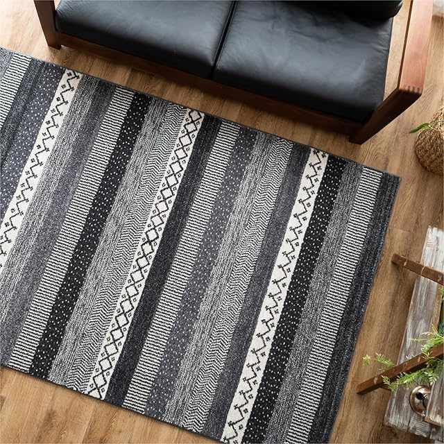 サヤンサヤン ボーダー柄 ラグマット ジオメトリーラインⅡ 80x150 1畳 チャコール ベルギー