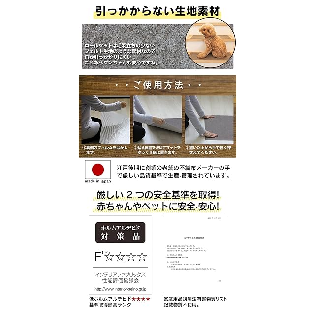 ・江戸後期に創業の老舗の不織布メーカーの手で厳しい品質基準で生産管理されています。ホルムアルデヒド★★★★基準取得最高ランク。家庭用品規制法有害物リスト記載物質不使用。厳しい2つの安全基準を取得しています。赤ちゃんやペットにも。