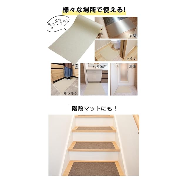 ・5メートルのロールをお好みの大きさにカットできるから玄関、キッチン、廊下、階段など様々な場所でお使いいただけます。