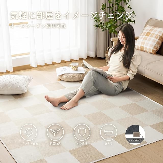 HARUMIN カーペット ラグ ラグマット 洗える 135×185cm 約1.5畳 絨毯 北欧 おしゃれ 抗菌 防臭 滑り止め オールシーズン 床暖房 ホットカーペット対応 床保護マット チェックベージュ