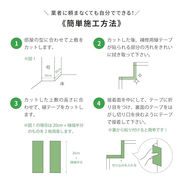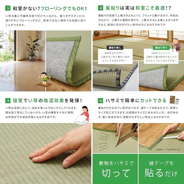 表面は、肌触りのよいイ草素材です。ご家庭で簡単にハサミで自在に切ることができます。柱や移動が大変な重い家具などがある部屋にもぴったり敷き詰めることができます。