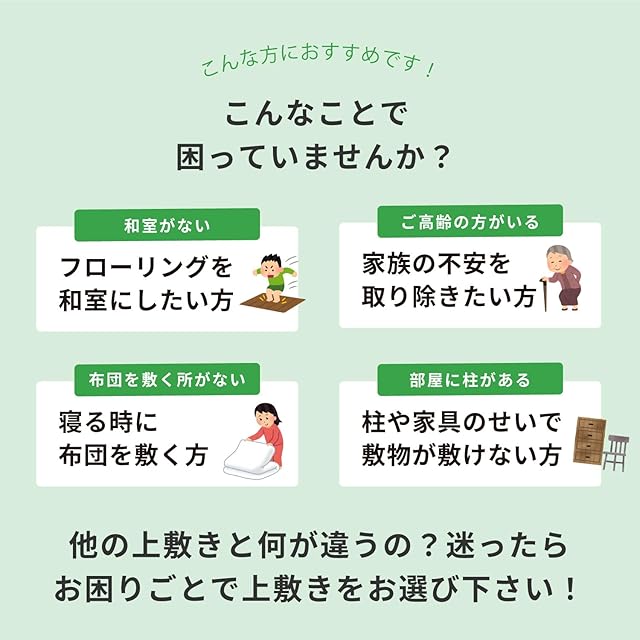 時が経つにつれ目立ってくる汚れや色褪せ。気になるけど畳を張り替えるのは費用もかかるし大変…そんなとき、上敷きをサッと敷くだけで簡単に和室をリフレッシュ。また、新築や賃貸など、新しい畳の上に敷いておくことで日焼けやキズを防ぎます。上敷きが痛んできたら新しい上敷きと取り替えれば、本来の畳を長く綺麗に保つことができます。