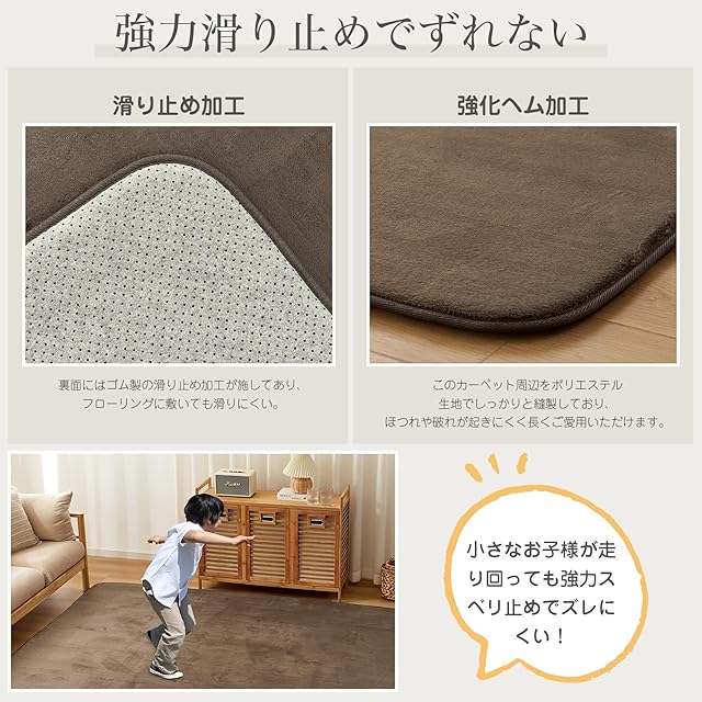 【滑り止め加工】裏面にはゴム製の滑り止め加工が施してあり、フローリングに敷いても滑りにくく、お子さまやお年寄りのいるご家庭でも安心です。ヘムの厚みを補強しているので、形が崩れにくいです。
