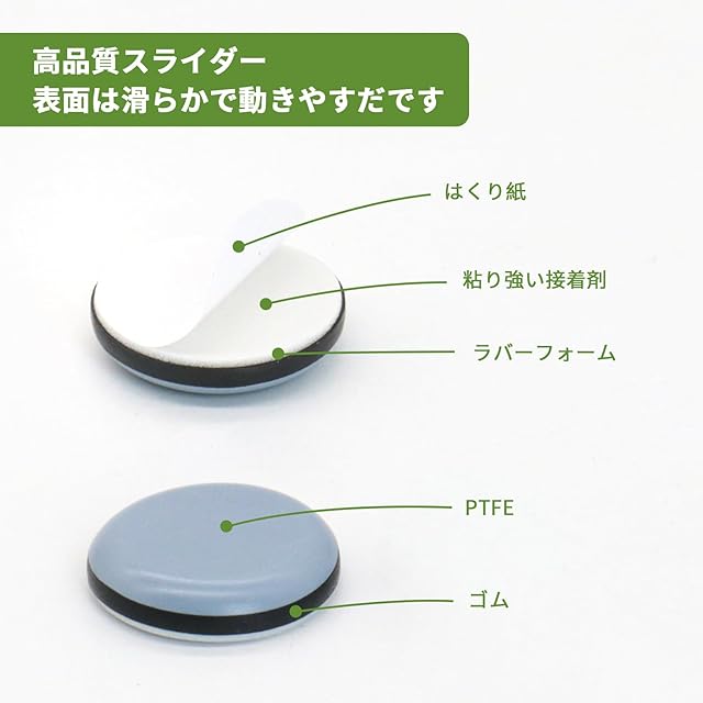 【キズ防止・防音】家具でこの移動パッドをつければ、移動する際の騒音にも有効的に防ぎ、床が傷つかずにキズ・ニック・ へこみから保護できます。高品質のプラスチック蓋付きの家具スライダーは耐久性があり、頻繁に家具に使用しても大丈夫で す。家具向き面はEVAフォームであり、蓋への圧力を減らして耐久性を高めることができます。