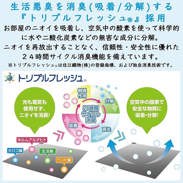 【トリプルフレッシュ採用】お部屋のニオイを吸着し、空気中の酸素を使って科学的に水や二酸化炭素などの無害な成分に分解。ニオイを再放出することなく、信頼性・安全性に優れた24時間サイクル消臭機能を備えています。※トリプルフレッシュは住江織物(株)の登録商標、および独自消臭技術です。