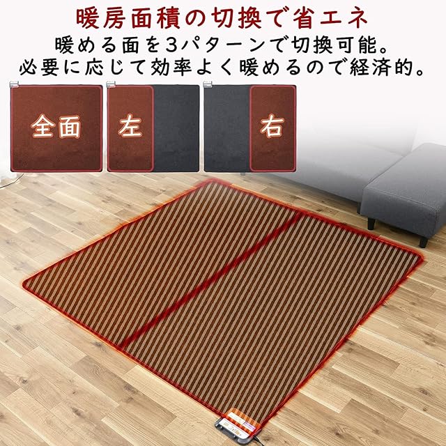 【商品仕様】本体サイズ:176×176cm/2畳相当、消費電力:520W、消費電力量(1時間あたり):目盛3=約230Wh/目盛5=330Wh、電気代目安(1時間あたり):目盛3=約7.1円/目盛5=約10.2円(1kW/h当り31円として計算)、表面温度(目安):目盛3=約36度/目盛5=45度、保証期間:お買い上げ日より1年間(保証の範囲については、保証書をご確認ください。(一般家庭用以外(業務用など)に使用された場合の故障及び損傷などは保証対象外となります))