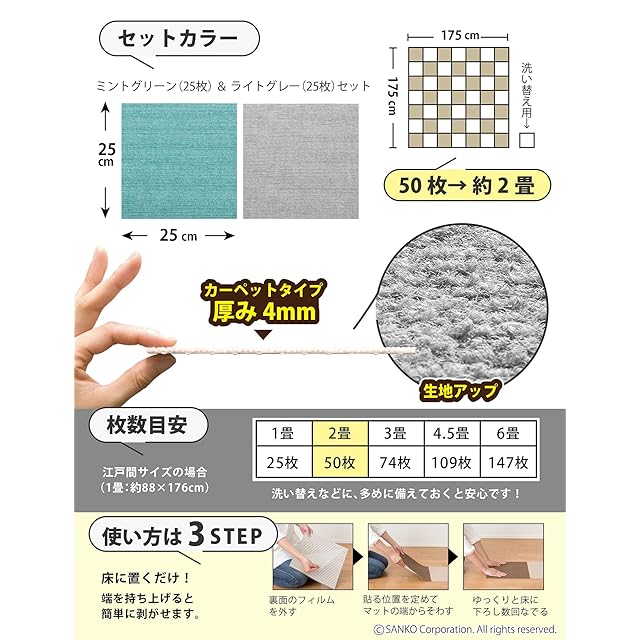 【2畳分】サイズ : 50枚組〈約3㎡〉(2色組、各25枚)25×25cm(厚み4mm)、重量:37g(1枚)