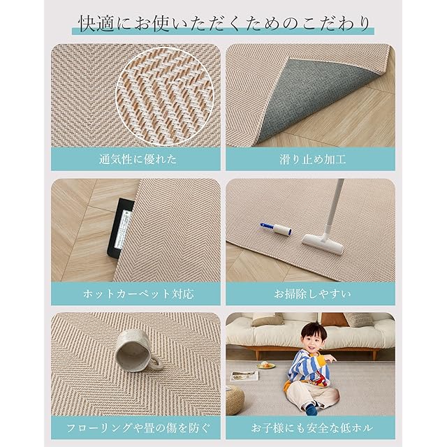 【安全仕様!お子様にも安心なカーペット】浮き毛のない編み込みカーペット、裏面には滑り止め加工をした不織布を使用して、防臭・防ダニ加工を施し、消臭率とホルム検査合格し、お子様にも安心してお使いいただけます!