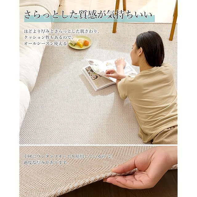【さらとした質感!年中使えるラグマット】ジャカード織りは繊維の隙間に優れた通気性を与え、さらっとしているのに柔らかく、暑い夏や湿気の多い環境でも、優しい肌触り。さらに、ホットカーペットや床暖房に対応しているので、年中使えるからお財布にも優しい仕様です。