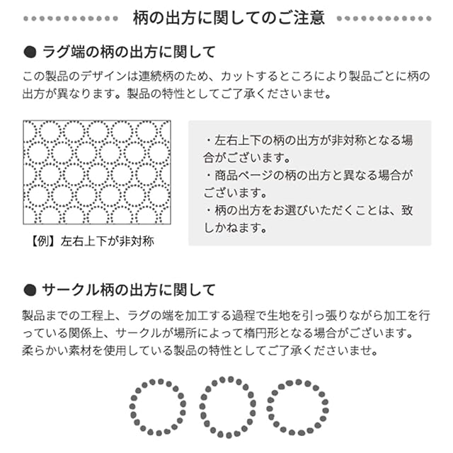 【注意】※ご覧のモニターの環境、撮影環境により実物と色味が異なって見える場合が御座います。※折りたたんだ状態でのお届けのため、開封後折じわが残っている場合がありますが、ご使用につれ徐々に解消されます。ご使用の環境により多少お時間が掛かる場合もございます。※ラグ端の柄の出方に関して、連続柄のため、製品ごとに、柄の出方が異なります。また、サークルの出方が、場所によっては楕円形になってしまう場合がございます。商品の製造過程において、どうしても発生してしまうものになります。商品画像でも、楕円状になっている箇所がございますので、そちらをイメージとして、ご確認をお願い致します。