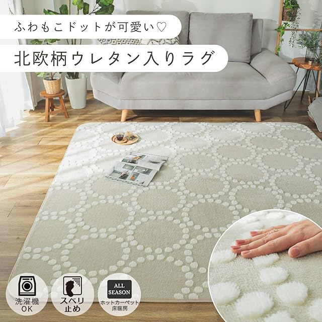 【洗濯機OK・滑り止め付き】汚れても、洗濯ネットを用いれば、洗濯機で洗うことができます。おしゃれなラグだからこそ、キレイに清潔に保ちたい、でも、お手入れが面倒…。このラグは洗濯機で丸洗いすることができるので、お手入れも簡単で、オシャレさもキープすることができます。また、裏面はしっかり滑り止めがついています。そのため、ズレにくい作りになっています。一人暮らしのお客様だけじゃなく、子様部屋のようなお子様・赤ちゃんがいるご家庭でも、滑り止め効果とふわふわラグのおかげで、快適に過ごすことができ、また汚れても気軽の洗って清潔にご使用いただけます。