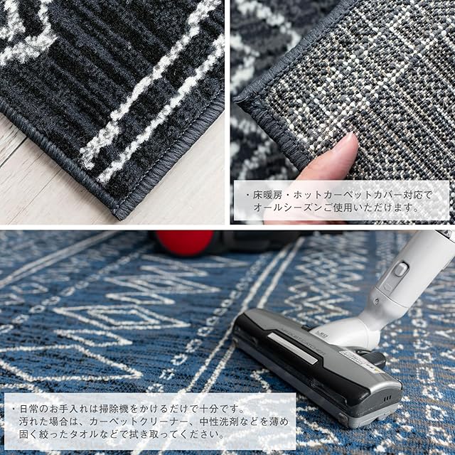 【輸入カーペットを安心してご利用いただくためのお願い】 ●輸入ラグに関して ※同じ商品でも製造ロットの違いによって、サイズや、色味、柄模様の左右が反転していたり、位置がズレている場合がございます。ただし、現地の工場や倉庫での検品をクリアした商品を輸入しています。あらかじめご了承くださいませ。/ ●においに関して ※ご使用当初、裏面に塗られる仕上げの接着塗料(ラテックス剤)のにおいがする場合がございます。人体への影響はありませんが、においに敏感の方や、ご心配の方はご理解の上ご購入お願いいたします。開封後常温のもとで気化(蒸発)するため、においはご使用につれてなくなります。気になる場合は風通しの良いところで陰干ししていただきますと、より早く解消されます。/ ●サイズに関して ※カーペットの製法上、表示サイズより0~3%の誤差がございます。/ ※いずれも商品の初期不良ではございませんので返品・交換は行なっておりません。(※お客様で返品の送料ご負担によるキャンセルは、返品規定に基づきお受けさせていただきます。)/ ※裏面の製品シールは剥がさないでご使用ください。