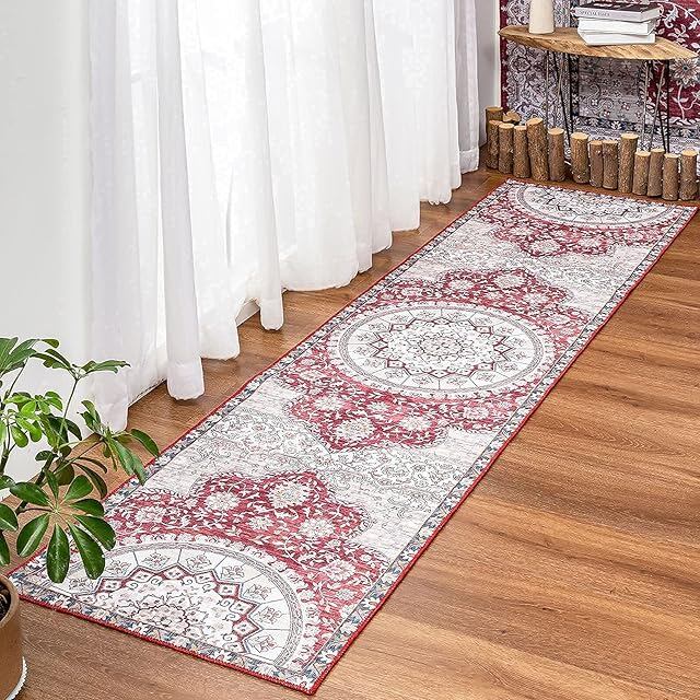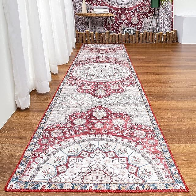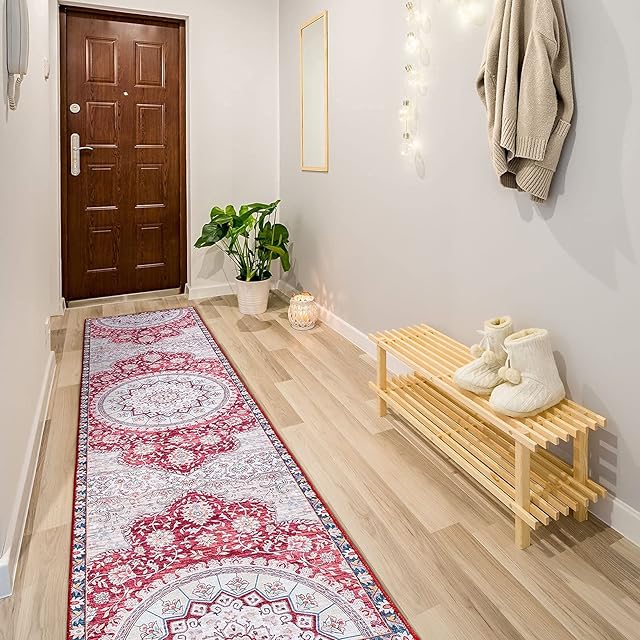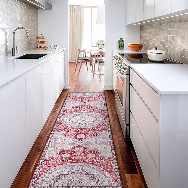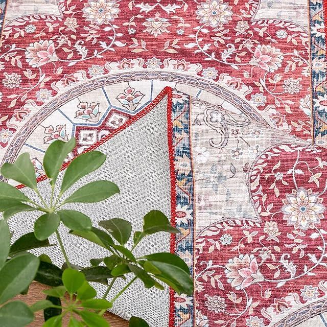 DECOMALL キッチンマット 240 洗える 廊下 マット カーペット ペルシャ風 60x240CM 台所マット おしゃれ オールシーズン 軽量 滑り止め 花柄 防ダニ 防虫 防臭 レッド 床暖房対応