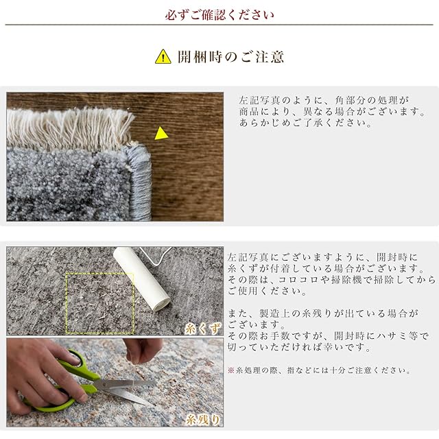 【輸入カーペットを安心してご利用いただくためのお願い】 ●輸入ラグに関して ※同じ商品でも製造ロットの違いによって、サイズや、色味、柄模様の左右が反転していたり、位置がズレている場合がございます。ただし、現地の工場や倉庫での検品をクリアした商品を輸入しています。あらかじめご了承くださいませ。/ ●においに関して ※ご使用当初、裏面に塗られる仕上げの接着塗料(ラテックス剤)のにおいがする場合がございます。人体への影響はありませんが、においに敏感の方や、ご心配の方はご理解の上ご購入お願いいたします。開封後常温のもとで気化(蒸発)するため、においはご使用につれてなくなります。気になる場合は風通しの良いところで陰干ししていただきますと、より早く解消されます。/ ●サイズに関して ※カーペットの製法上、表示サイズより0~3%の誤差がございます。/ ※いずれも商品の初期不良ではございませんので返品・交換は行なっておりません。(※お客様で返品の送料ご負担によるキャンセルは、返品規定に基づきお受けさせていただきます。)/ ※裏面に製品シールが貼っている場合は剥がさないでご使用ください。