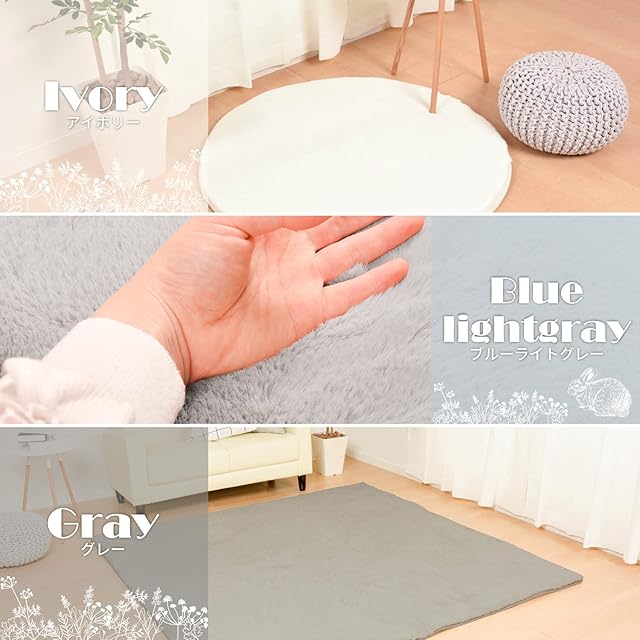 とろけるようなやさしい肌触りを追求しました。まるで本物のウサギを撫でているようななめらかでとろけるようなタッチ感です。色味をおさえたダスティなカラー展開と角形と円形の多サイズ展開も魅力です。北欧系や姫系なお部屋づくりはもちろん、大人可愛いおしゃれなお部屋づくりにも活躍してくれそうな一枚です。
