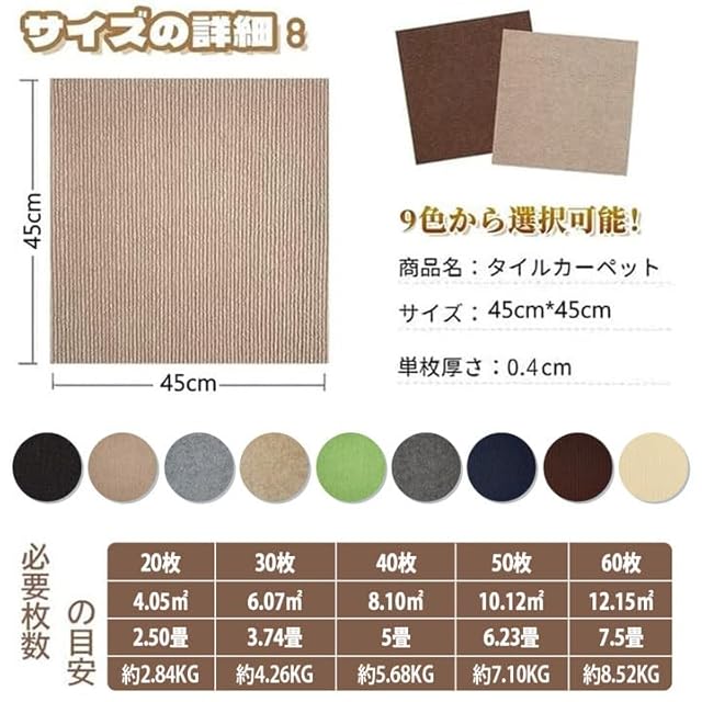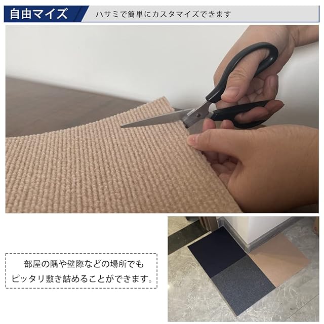 【薄手吸着マット、形に合わせて自由にカット】各ピースサイズは幅45cm×長さ45cm×厚さ4mm。タイルマットのもう1つの特徴は、ハサミで簡単にカットできることです。お部屋のサイズ、形状に合わせてぴったりと敷きこむことも可能です。自分のニースに応じて台所、リビング、廊下など色々な場所に敷いて頂けます。