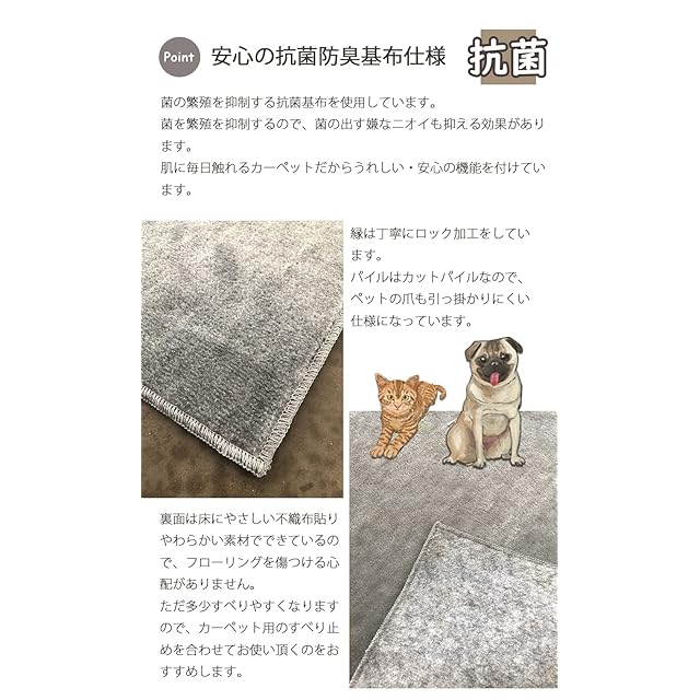 【商品詳細】組成:表地 ポリエステル100%、 裏:不織布貼り、 生産国:日本製、 カットパイル、 梱包:折りたたみ、 機能:抗菌・防ダニ基布使用