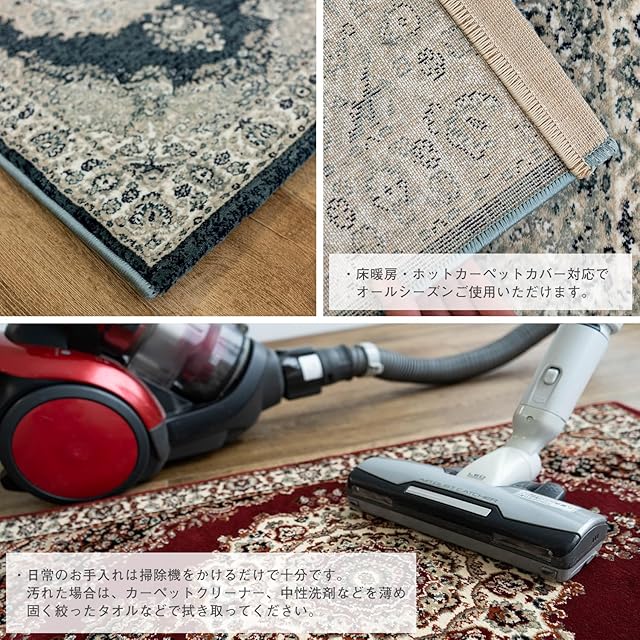【輸入カーペットを安心してご利用いただくためのお願い】 ●輸入ラグに関して ※同じ商品でも製造ロットの違いによって、サイズや、色味、柄模様の左右が反転していたり、位置がズレている場合がございます。ただし、現地の工場や倉庫での検品をクリアした商品を輸入しています。あらかじめご了承くださいませ。/ ●においに関して ※ご使用当初、裏面に塗られる仕上げの接着塗料(ラテックス剤)のにおいがする場合がございます。人体への影響はありませんが、においに敏感の方や、ご心配の方はご理解の上ご購入お願いいたします。開封後常温のもとで気化(蒸発)するため、においはご使用につれてなくなります。気になる場合は風通しの良いところで陰干ししていただきますと、より早く解消されます。/ ●サイズに関して ※カーペットの製法上、表示サイズより0~3%の誤差がございます。/ ※いずれも商品の初期不良ではございませんので返品・交換は行なっておりません。(※お客様で返品の送料ご負担によるキャンセルは、返品規定に基づきお受けさせていただきます。)/ ※裏面の製品シールは剥がさないでご使用ください。