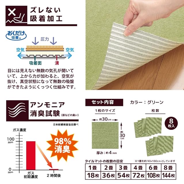 サンコー おくだけ吸着 獣医師推奨 ペット用撥水タイルマット 30cm×30cm 8枚入 グリーン 犬 猫 サンコー カーペット 【日本製 撥水 消臭 洗える ハサミでカット可】 KH-51