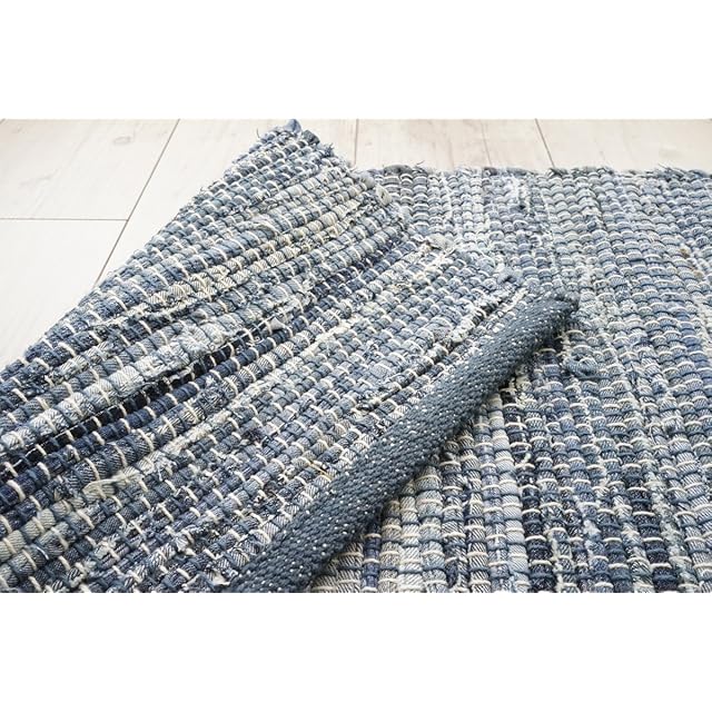 サヤンサヤン 洗える 手織り 玄関マット 室内 デニムラグ 70x120 ブルー 平織り インド