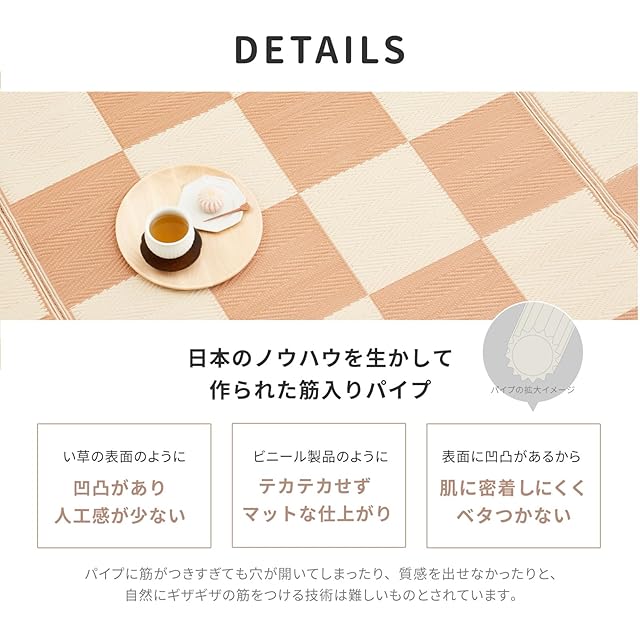 見た目は、い草のようですが、実は、素材はポリオレフィン系複合樹脂を使用しています。カビが発生しないからダニがよりにくいのが特徴です。さらに、抗菌加工を施しているので、菌の増殖を抑制し嫌な臭いを防ぎます。