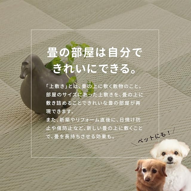 水こぼしや汚れに強くてお手入れ簡単。水洗いも可能なので清潔さをキープできます。新調した畳や汚れた畳の上に敷き詰めたり、ラグとして使ったり、運動会や海水浴などのアウトドアにもお使いいただけます。