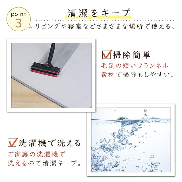 【短毛・掃除がラク・滑り止め付】:毛足の短いフランネル素材で掃除もしやすい。滑り止め付きでズレにくくストレスフリー。