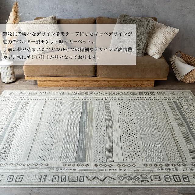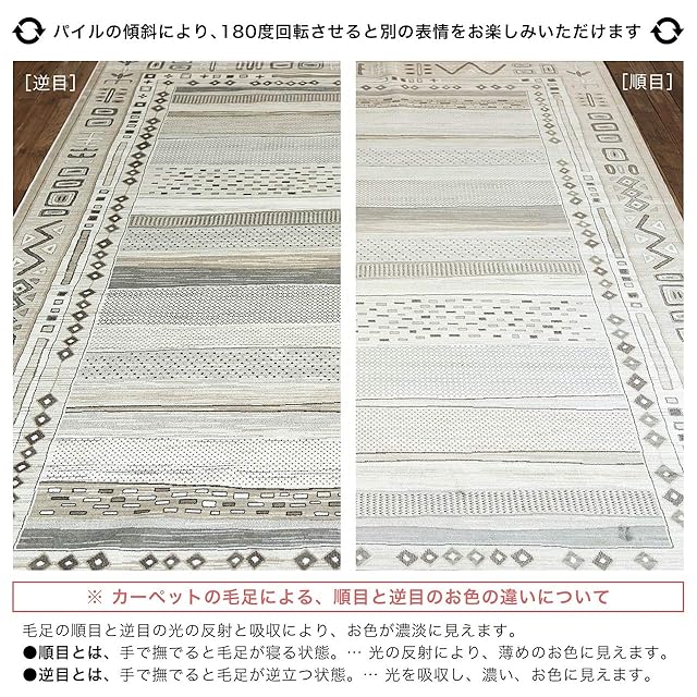 【輸入カーペットを安心してご利用いただくためのお願い】 ●輸入ラグに関して ※同じ商品でも製造ロットの違いによって、サイズや、色味、柄模様の左右が反転していたり、位置がズレている場合がございます。ただし、現地の工場や倉庫での検品をクリアした商品を輸入しています。あらかじめご了承くださいませ。/ ●においに関して ※ご使用当初、裏面に塗られる仕上げの接着塗料(ラテックス剤)のにおいがする場合がございます。人体への影響はありませんが、においに敏感の方や、ご心配の方はご理解の上ご購入お願いいたします。開封後常温のもとで気化(蒸発)するため、においはご使用につれてなくなります。気になる場合は風通しの良いところで陰干ししていただきますと、より早く解消されます。/ ●サイズに関して ※カーペットの製法上、表示サイズより0~3%の誤差がございます。/ ※いずれも商品の初期不良ではございませんので返品・交換は行なっておりません。(※お客様で返品の送料ご負担によるキャンセルは、返品規定に基づきお受けさせていただきます。)/ ※裏面の製品シールは剥がさないでご使用ください。