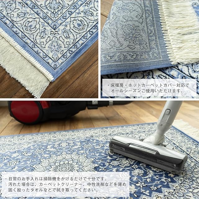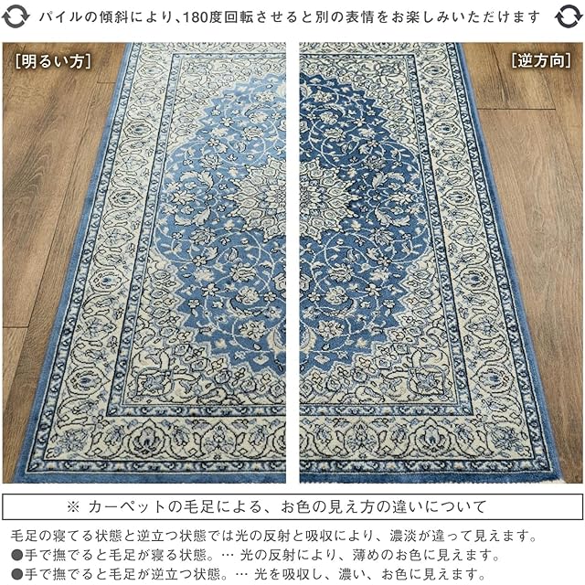 【輸入カーペットを安心してご利用いただくためのお願い】 ●輸入ラグに関して ※同じ商品でも製造ロットの違いによって、サイズや、色味、柄模様の左右が反転していたり、位置がズレている場合がございます。ただし、現地の工場や倉庫での検品をクリアした商品を輸入しています。あらかじめご了承くださいませ。/ ●においに関して ※ご使用当初、裏面に塗られる仕上げの接着塗料(ラテックス剤)のにおいがする場合がございます。人体への影響はありませんが、においに敏感の方や、ご心配の方はご理解の上ご購入お願いいたします。開封後常温のもとで気化(蒸発)するため、においはご使用につれてなくなります。気になる場合は風通しの良いところで陰干ししていただきますと、より早く解消されます。/ ●サイズに関して ※カーペットの製法上、表示サイズより0~3%の誤差がございます。/ ※いずれも商品の初期不良ではございませんので返品・交換は行なっておりません。(※お客様で返品の送料ご負担によるキャンセルは、返品規定に基づきお受けさせていただきます。)/ ※裏面の製品シールは剥がさないでご使用ください。
