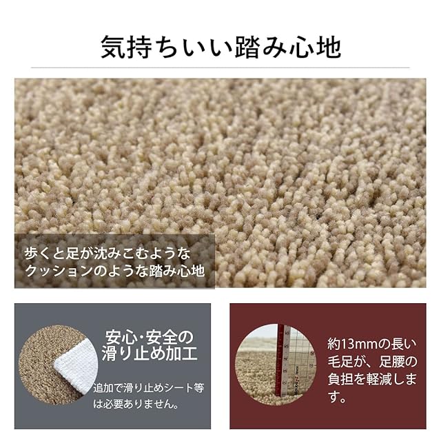 【特徴】ふかふかの足ざわりが気持ちいい厚みあるしっかりとした日本製廊下カーペット。【すべり止め】マットの裏面には、不織布に合成ゴム(ホットメルト)を溶着しているので、滑りにくく安全です。 別途、滑り止めシートをお求め頂く必要はございません。