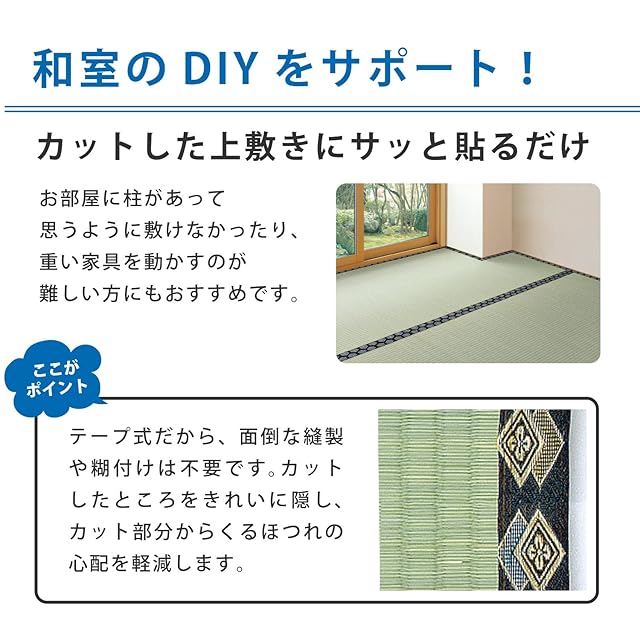 表面は、撥水加工で水に強く、肌触りのよい い草素材です。ご家庭で簡単にハサミで自在に切ることができます。柱や移動が大変な重い家具などがある部屋にもぴったり敷き詰めることができます。