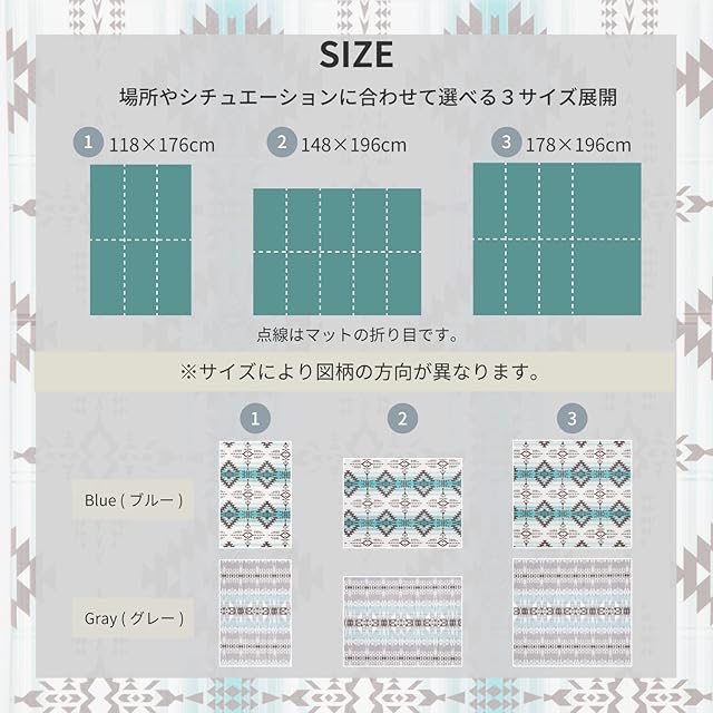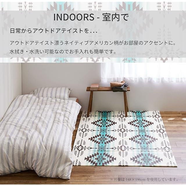 リバーシブル仕様です。表柄は、アウトドアテイスト漂うネイティブアメリカン柄、裏柄はシンプルな木目柄です。お部屋のインテリアやその日の気分にあわせて使い分けできます。