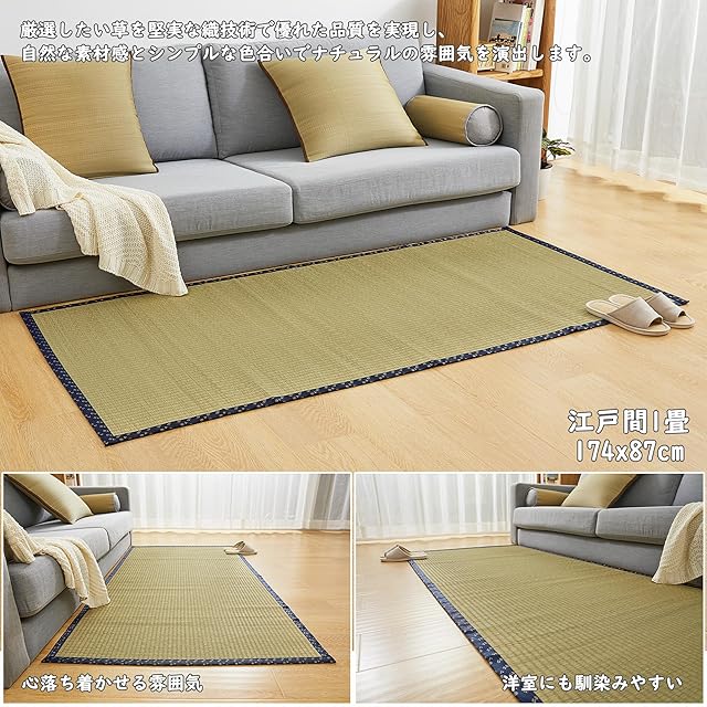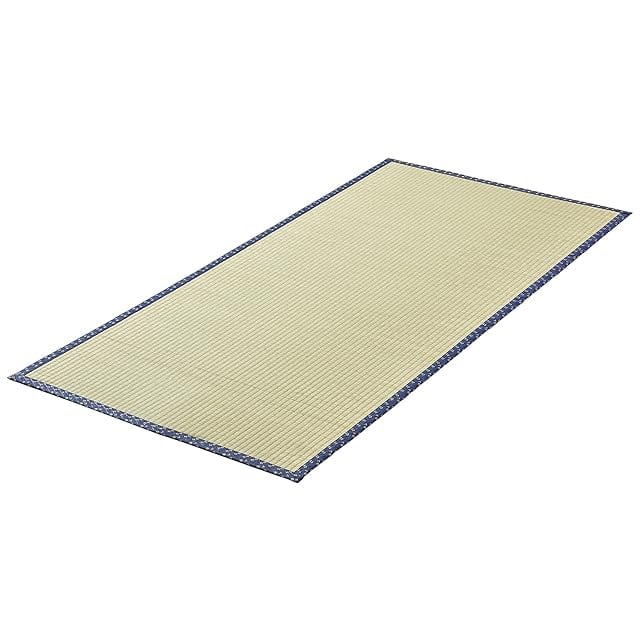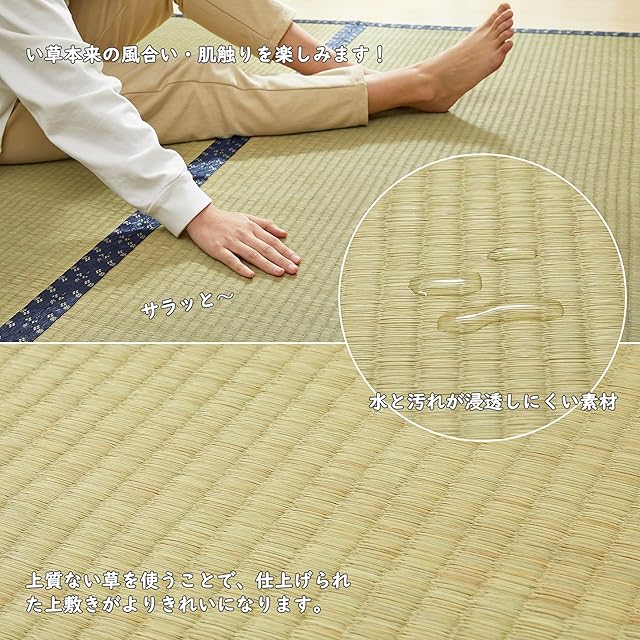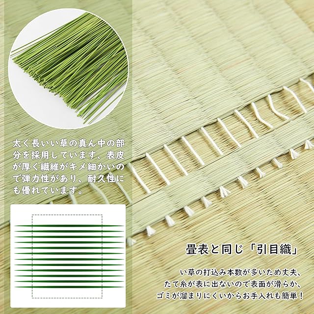 畳と同じ織り方の引目織で仕上げられたい草上敷き、い草の打込み本数が多いため丈夫、糸が表に出ないので表面が滑らか、ゴミも溜まりにくいです;厳選したい草を堅実な織技術で優れた品質を実現し、自然の素材感とシンプルな色合いでナチュラルな雰囲気を演出し、インテリアテイストを選ばず、和室にも洋室にも心地よく馴染み、天然素材の魅力を感じさせます。