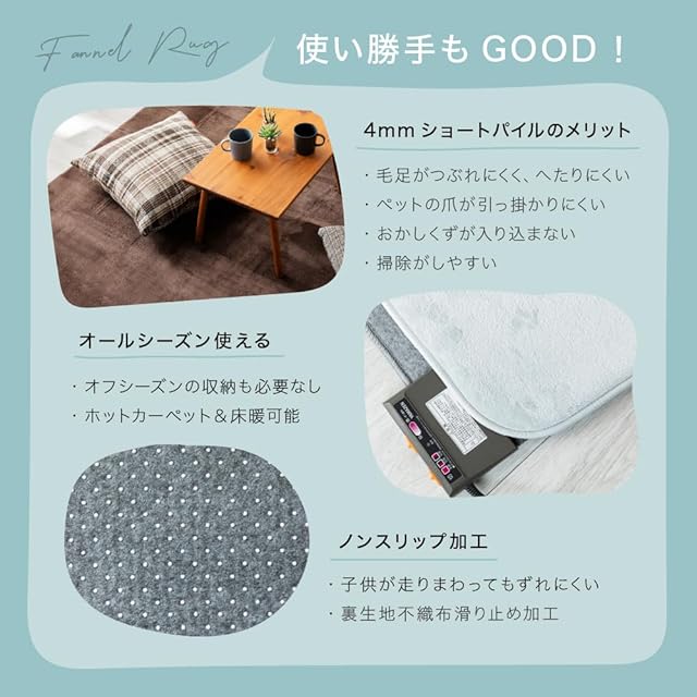 【特長】なめらかな肌ざわりと安心感のあるしっかりした厚みで居心地もバツグン。「抗菌防臭・防ダニ加工済」の清潔仕様。季節を問わずオールシーズン使えるラグだから、収納スペースを確保する必要もありません。