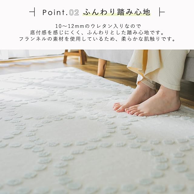 【ウレタン入りでふっくら、表面は柔らか】10~12mmのウレタン入りで底つき感を感じにくくふんわりとした踏み心地です。寝転んでも、寝転んだまま肘をついて本を読んでも、底つき感を感じにくいので、ふかふかです、また、表面はフランネルの素材を使用しています。そのため、表面はしっとり柔らかな感じになっており、寝転がった際にも気持ち良いのもポイントです。