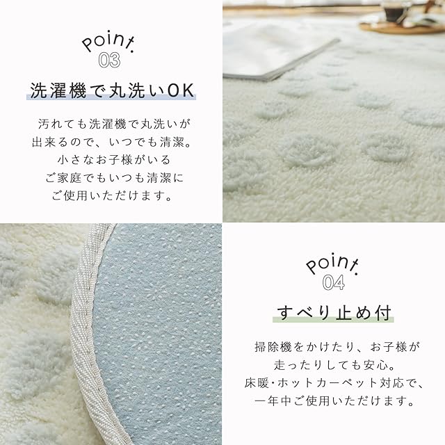【洗濯機OK・滑り止め付き】汚れても、洗濯ネットを用いれば、洗濯機で洗うことができます。おしゃれなラグだからこそ、キレイに清潔に保ちたい、でも、お手入れが面倒…。このラグは洗濯機で丸洗いすることができるので、お手入れも簡単で、オシャレさもキープすることができます。また、裏面はしっかり滑り止めがついています。そのため、ズレにくい作りになっています。一人暮らしのお客様だけじゃなく、子様部屋のようなお子様・赤ちゃんがいるご家庭でも、滑り止め効果とふわふわラグのおかげで、快適に過ごすことができ、また汚れても気軽の洗って清潔にご使用いただけます。